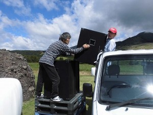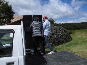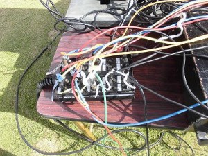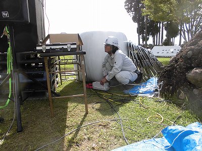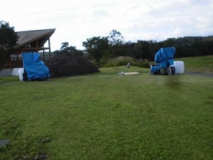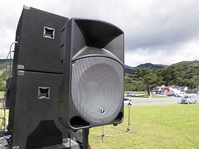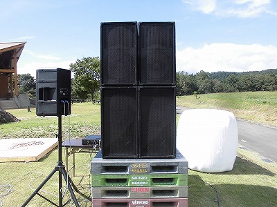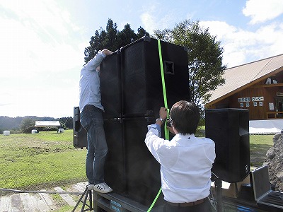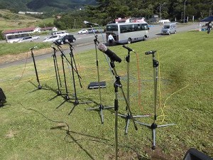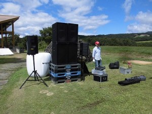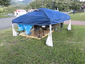 明日までの機材の保護策として、PAブースは、テントの高さを下げて、内部にも一部シートを掛けて養生しました。六呂師高原では、この時期、夜間の夜露が非常に多く、晴天でも朝になるとすべてがベタベタに濡れています。